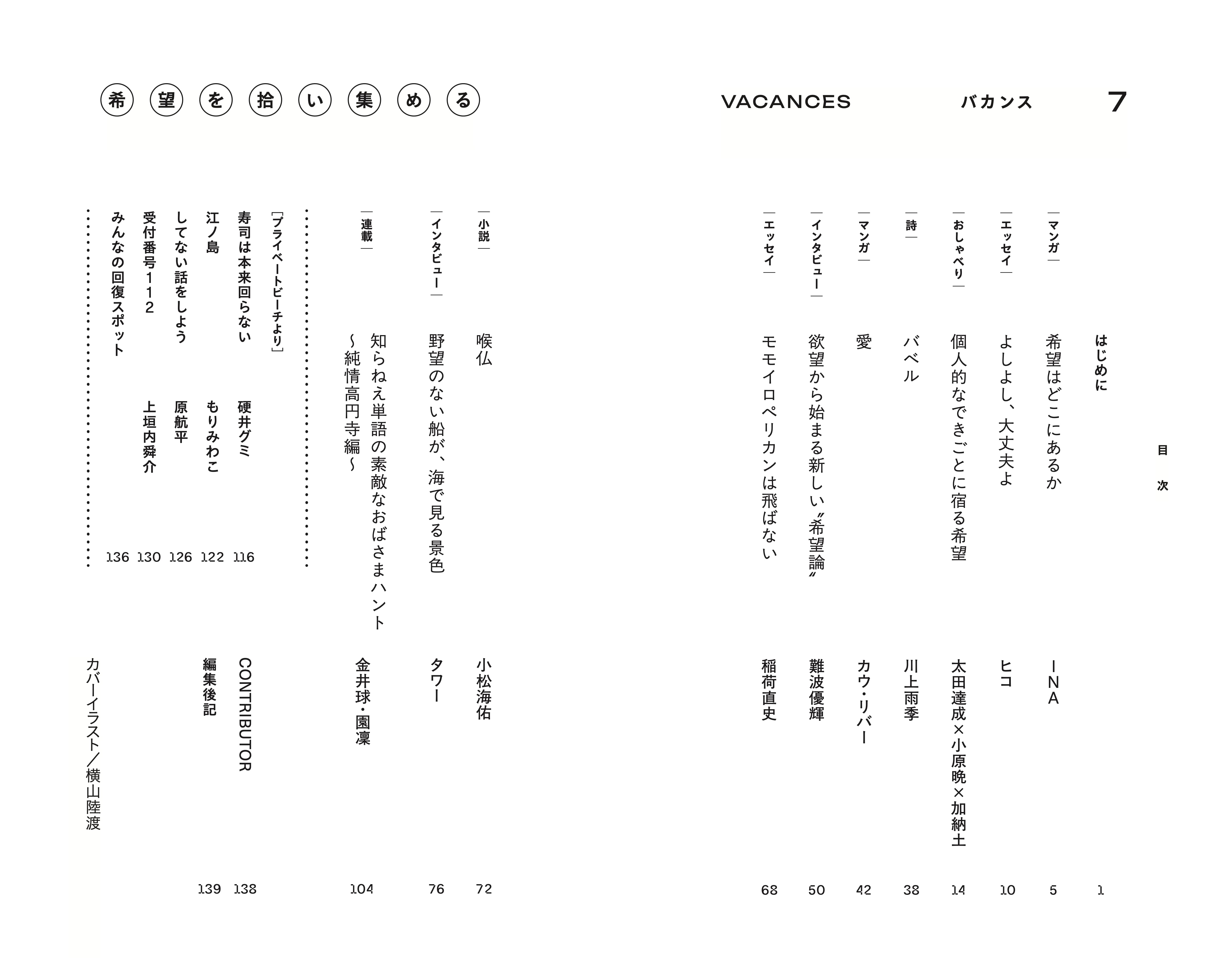 編集・ライターの仕事をしている原航平と上垣内舜介が企画し、インディペンデントな体制で作っているカルチャー雑誌『VACANCES』。1年ぶりに発行する第7号のテーマは、「希望」。希望というのはどこか薄っぺらい言葉でもありますが、絶望がすぐそばにある今の時代だからこそ本来の意味の希望を改めて考え、自分の足元にある大事なもの、近くにあるのに見逃していたものを拾い集める試みをしました。SNSには憶測の言葉や陰謀論が蔓延していますが、陰謀論に対抗する実感としての「希望論」を見出したいよねと話し合ったのが、今号制作の起点です。